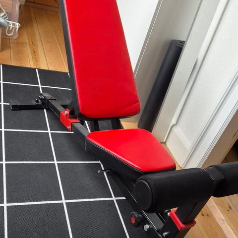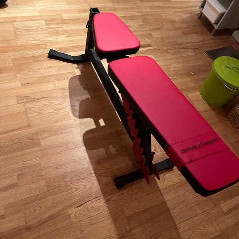 Justerbar træningsbænk med brun polstring og sort metalstel. Bænken har flere indstillingsmuligheder i både sæde og ryg, så hældningen kan tilpasses forskellige øvelser. Egnet til styrketræning i hjemmet, f.eks. bænkpres med håndvægte, mave- og rygøvelser samt andre øvelser, der kræver stabil støtte. Polstrede flader giver støtte under træning, og den buede justeringsskinne gør det muligt at ændre vinkel efter behov.