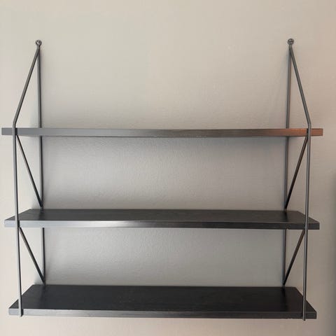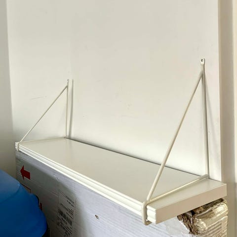IKEA væghylder i hvid. To lange hylder monteret på væg med hvide metalbeslag. Velegnet til opbevaring af bøger, dekoration eller køkkenudstyr. Enkel, moderne stil, der passer ind i de fleste rum som stue, kontor, køkken eller værelse.