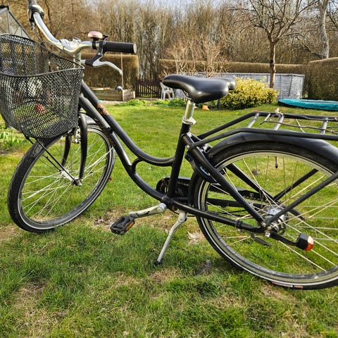 Hånd + fodbremser, ringeklokke, kurv, lygter og lås.