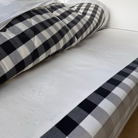 Hästens elevationsseng med karakteristisk blåternet betræk. Sengen har polstret, hvid liggeflade med knaplukning og blåternet kant.