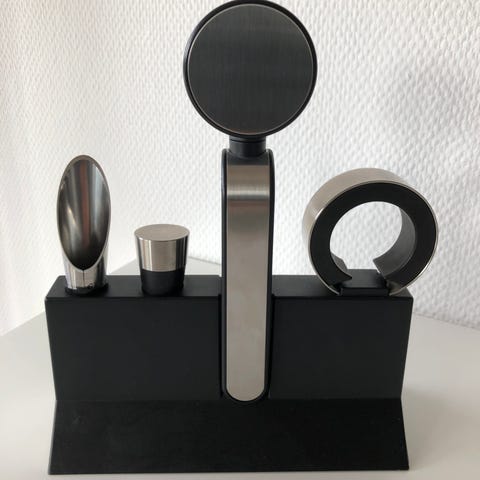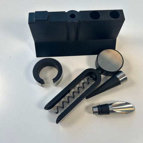 Rosendahl Grand Cru vinsæt i stål med holder. Sættet består af Vinprop, skænkeprop, proptrækker og folieskærer i børstet stål monteret i en sort base, der samler delene ét sted.