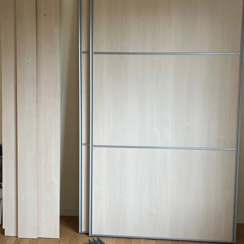 Et gammeldags indbygget skab med træ skydelåger i skinner. Det er malet hvidt og vi er ikke bekendt med dets træsort eller original udtryk (måske fint mørkt træ som på sidste billede?)