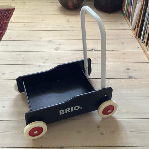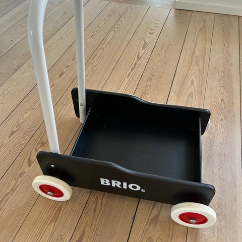 BRIO gåvogn i sort med hvide håndtag og hjul med rød detalje. Klassisk model med solid træbund. Kun brugt indendørs.