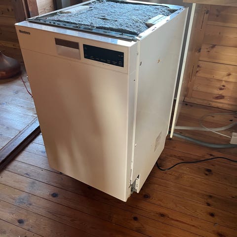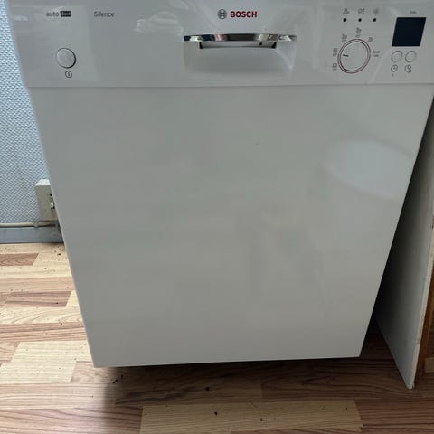 Bosch opvaskemaskine underbygget i hvid. Maskinen er beregnet til montering under bordplade. Fronten er hvid med betjeningspanel øverst på lågen. Bagsiden viser tilslutningsslanger og strømtilslutning. Energietiketten angiver energiklasse E og et årligt energiforbrug på 94 kWh ved standardbrug. Velegnet til indbygning i køkken, hvor der ønskes en underbygget opvaskemaskine i standardbredde.