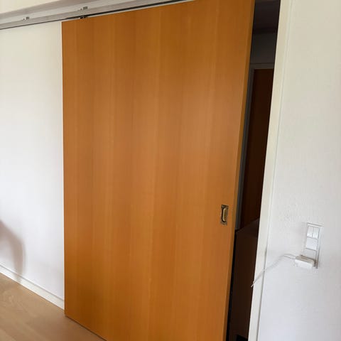 Flot indvendig skydedør i træ med læderstropper som håndtag. Skinne / beslag medfølger. Ekskl. karm og skelet (det skal køber selv bygge).
