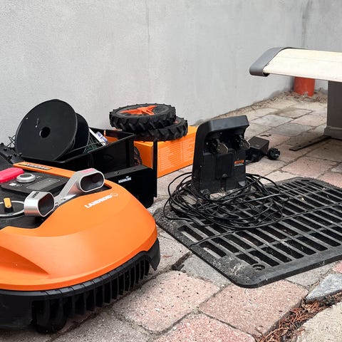 Robotplæneklipper Model Landroid M500 plus (WR165e), 5mAh stort batteri(brugt under 600 cycles), Off Limits (ekstraudstyr) med kabel, 220m afgrænsningskabel med pløkker(brugt), 150m original kabel(ny), offroad hjul(brugt), standard hjul(nye), garage med vippefunktion, klips til kabelbrud, 2 sæt knive(nye).