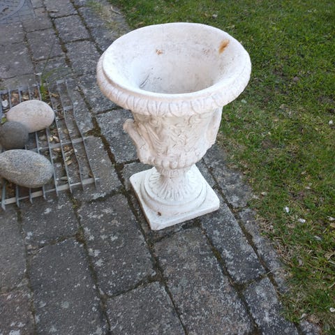 Antik krukke på beton fod til udendørs brug i hvidlig farve. Klassisk, riflet form med bred åbning øverst. Egnet til beplantning i have. Overfladen fremstår patineret med synlige brugsspor, som giver et rustikt udtryk.
