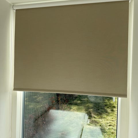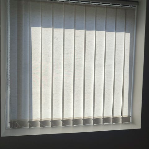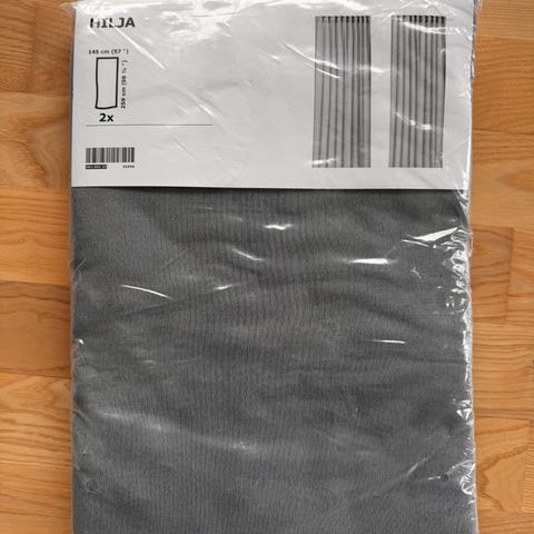 Gray IKEA blind. Horizontal slat blind suitable for mounting in a window. It can be raised and lowered as needed for light control and privacy. The blind has a compact design and can be folded up when not in use.
