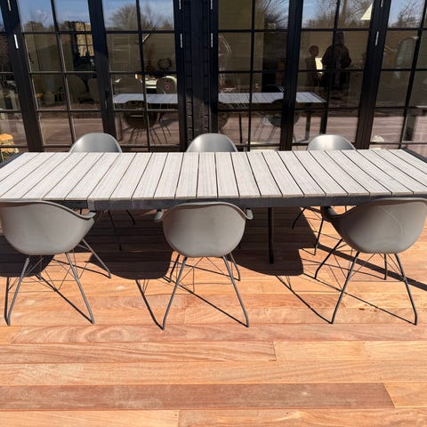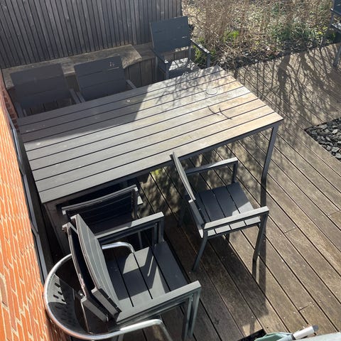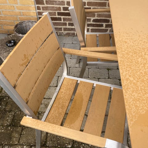 Havebord med 8 stole. Bord med stel i metal og bordplade i komposit.