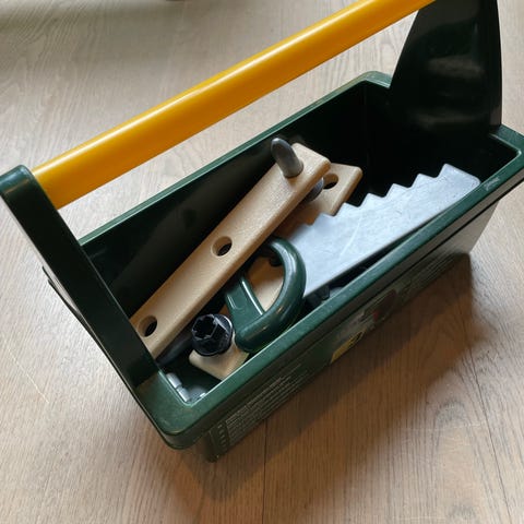 Værktøjskasse og arbejdshjelm til den lille håndværker. Godt blandet med mærker fra blandt andet Bosch og Technic, perfekt til leg med den bedste ven, da der er 2 af flere af tingene.
