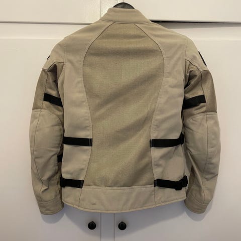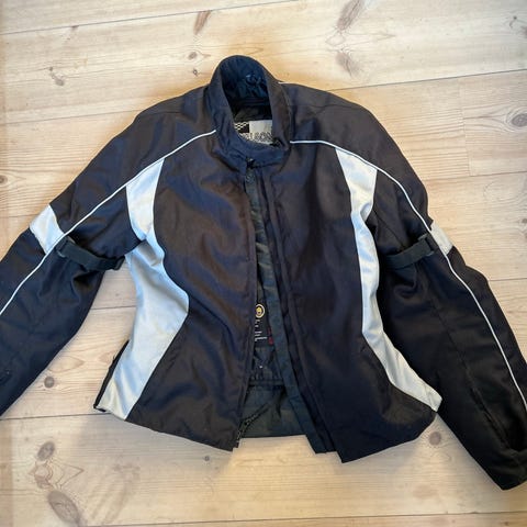 Hela dame small motorcykeljakke i sort og grå. Jakken har høj krave, frontlukning med lynlås og brugt et par weekender.