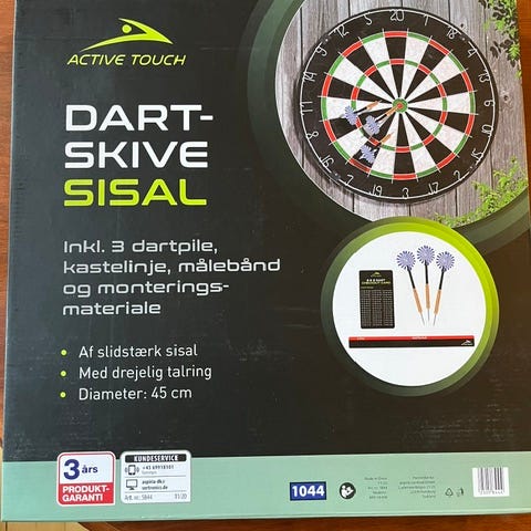 Rund dartskive med klassisk opdeling og tydelige talmarkeringer på begge sider. Medfølgende plastpile i flere farver.