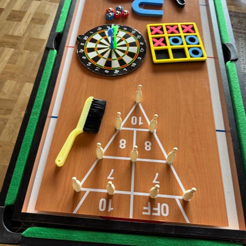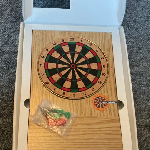 Dobbeltsidet trædartskive med mange forskellige dartpile