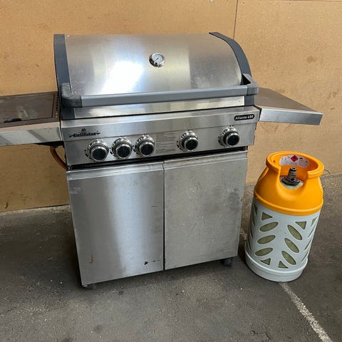 Gasgrill med flere brændere og sidebrænder. Grillen har låg med integreret grillrist og varmehylde. Front og arbejdsflader er i rustfri stål med sideborde på begge sider. Der er skab under grillen til opbevaring af gasflaske eller grilltilbehør. Grillen står på hjul, så den er nem at flytte rundt. Tilslutning til gas med medfølgende gasslange fremgår af billederne.