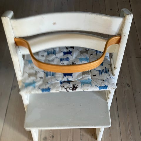 Stokke højstol i hvid. Klassisk træhøjstol med justerbar siddeplade og fodplade, der kan tilpasses barnets højde. Egnet til brug ved spisebord eller som siddeplads til børn i forskellige aldre. Overfladen har synlige brugsspor enkelte steder, som ses på billederne.