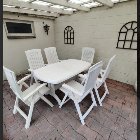 Havebord med 6 stole i aluminium - sættet trænger til en kærlig hånd.