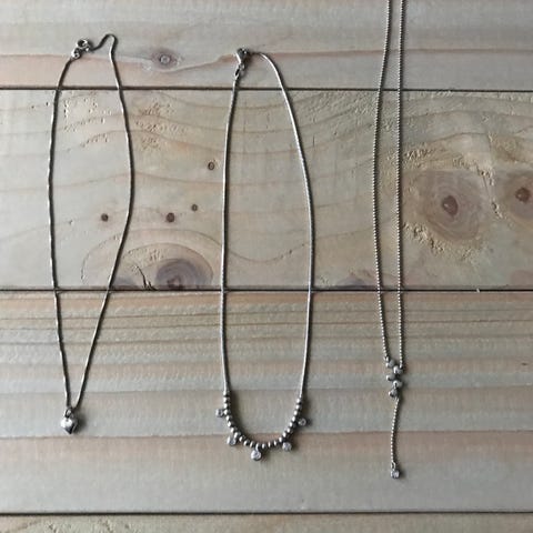 Lidt nyt til en flot bluse eller kjole? Fine og nye halskæder i sølvlook sælges. Kæden måler 49 cm. Og er derfor ikke lige så lang som vist på billedet.