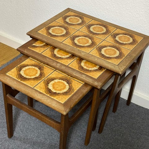 Sælger dette klassiske retro sæt af 3 indskudsborde fra 60'erne. Bordene er i flot stand med varmt teaktræ og håndmalede keramiske fliser med abstrakte motiver.