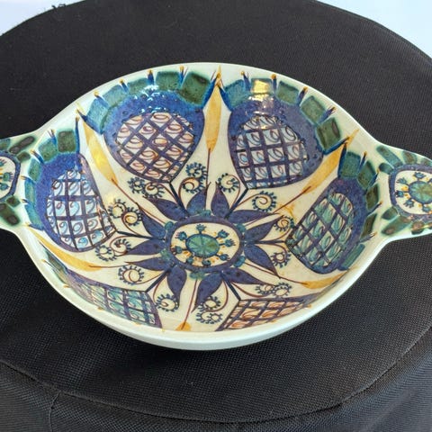 Ikonisk skål fra Tenera-serien, designet af Marianne Johanson (MJ) under ledelse af Nils Thorsson i 1958. Dette eksemplar bærer dekor 142 på form 2883. Motivet er skabt i den unikke teknik med silketrykte konturer og håndmalede glasurflader med malersignatur "W" i bunden.
