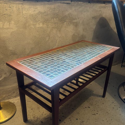 Flot og velholdt sofabord/lampebord i massivt teaktræ fra en dansk møbelproducent i 1970’erne. Klassisk, tidløst design med smukke detaljer og varm glød i træet.