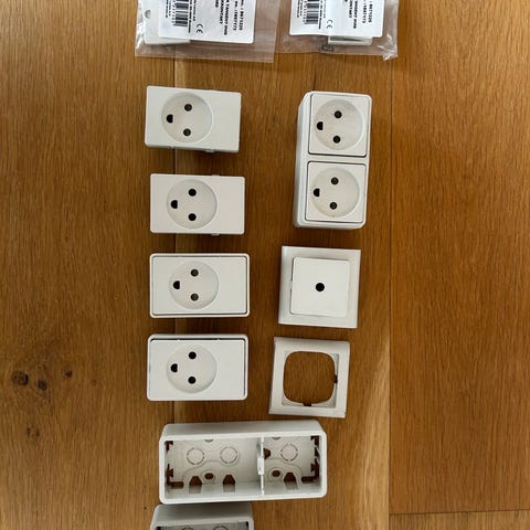 Fuga LK el-materiel blandet i hvid. Sættet omfatter forskellige indsatse, rammer, afdækningsplader og tilbehør til el-installationer i Fuga-systemet. Delene kan anvendes til f.eks. kontakter, afbrydere og andre installationer i boligen, hvor der i forvejen benyttes Fuga-komponenter. Antallet af de enkelte dele fremgår af billederne.