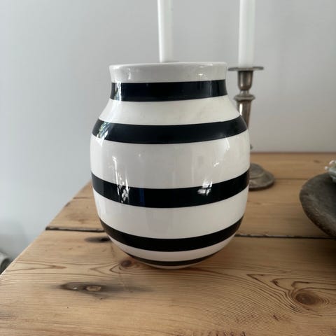 Kähler vase i keramik med tofarvet design i lyse og mørke nuancer. Vasen har en rund, buet form med bred åbning foroven. Egnet til dekoration i hjemmet, for eksempel med friske blomster, tørrede grene eller som enkeltstående pyntegenstand på bord, hylde eller vindueskarm.