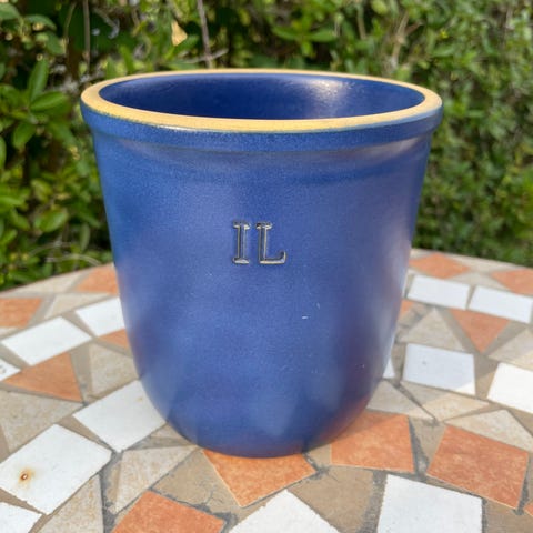 Smuk syltekrukke med blåt mønster og lyseblå bundglasur med “prikker”. Hel og fin brugt stand. Velegnet som Urtepotteskjuler, redskabskrukke eller opbevaringskrukke til frugt og grønt på køkkenbordet - eller noget helt fjerde.