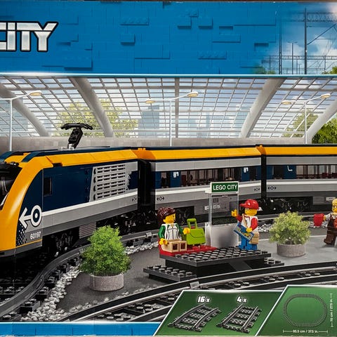 LEGO City togsæt med passagertog, skinner og minifigurer.