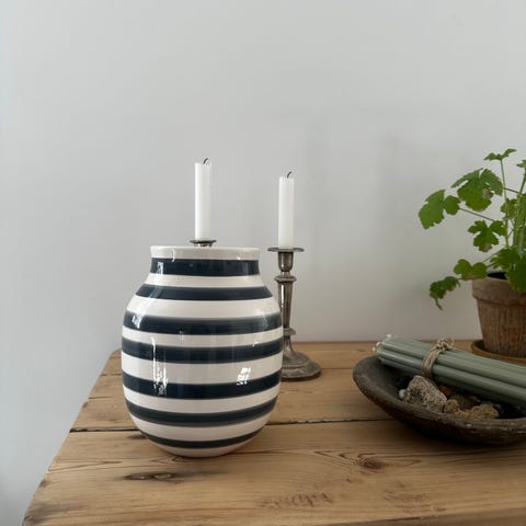 Kähler Omaggio vase med vandrette striber. Vasen er udført i keramik/porcelæn med blank glasur og karakteristiske brede striber. Egnet som dekorativ gulv- eller bordvase til blomster eller som enkeltstående indretningselement i hjemmet.