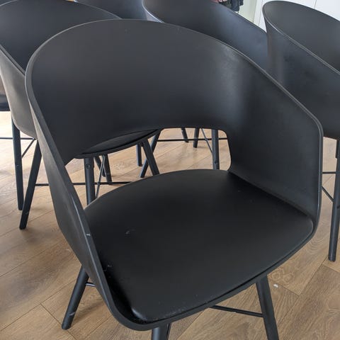 Spisebordsstole med sæde i cognacfarvet kunstlæder og ben i olieret egetræ.