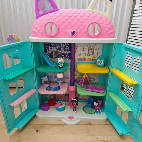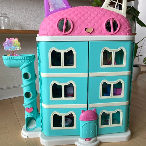 Disney dukkehus legetøjshus i farverigt plastdesign. Huset har flere etager og åbne døre på forsiden, så indersiden kan nås under leg. Velegnet til rolleleg med små figurer eller dukker i passende størrelse. Kan placeres på bord eller gulv og bruges som del af et større legeunivers med andre Disney-figurer og -sæt.