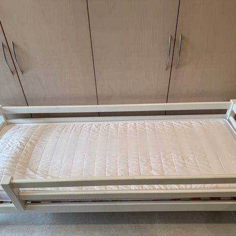 Hoppekids juniorseng i hvidmalet træ. Sengen har sengehest i siden samt to store skuffer under sengen til opbevaring. Velegnet som overgangsseng til børn, der er vokset ud af tremmesengen. Neutral, lys farve der passer ind i de fleste børneværelser. 70x140 cm. Helsemadras inkluderet.