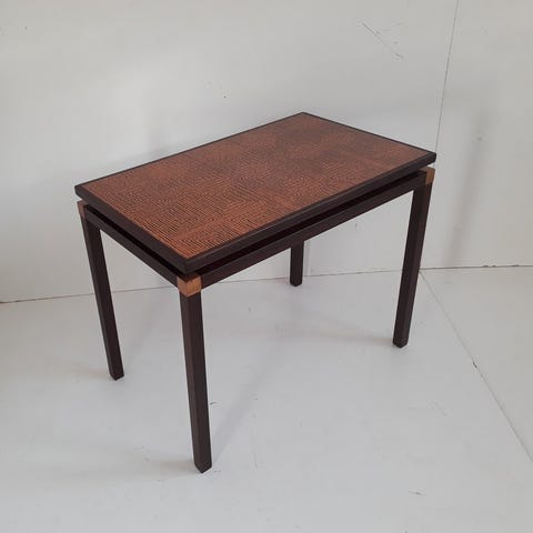 Dette bord er et klassisk eksempel på dansk møbelkunst fra 1960'erne eller 1970'erne. Ud fra de visuelle kendetegn er der tale om et sofabord eller sidebord i palisander med en plade af kobber.