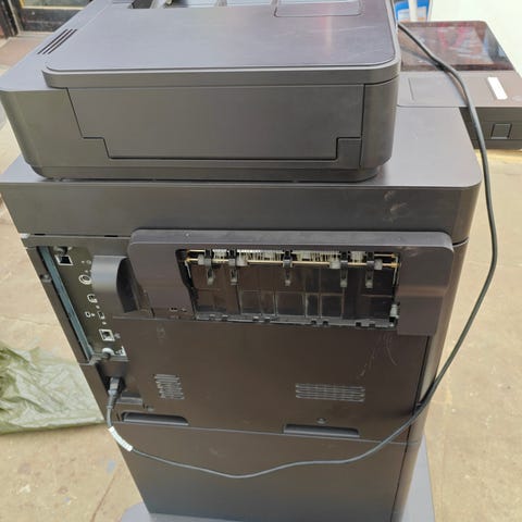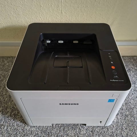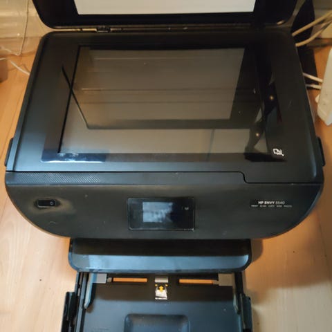 Sawgrass Virtuoso SG500 printer i hvid. Printeren har frontbetjent kontrolpanel med display og knapper samt papirbakke i fronten. Egnet til kontor- eller hobbybrug, f.eks. til print af dokumenter eller specialprint afhængigt af installeret blæk og papirtype. Tilslutningsmuligheder og øvrige tekniske specifikationer afhænger af den konkrete konfiguration og kan kontrolleres i producentens dokumentation.Alt virker fint, patronerne er ude.