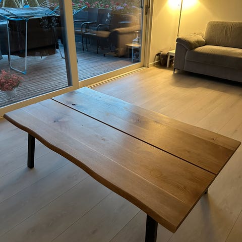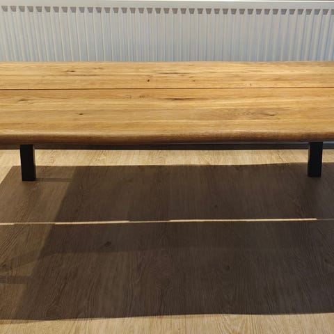 Stel: Slankt og elegant stel i sortlakeret metal, der giver et let udtryk i stuen trods den massive bordplade.