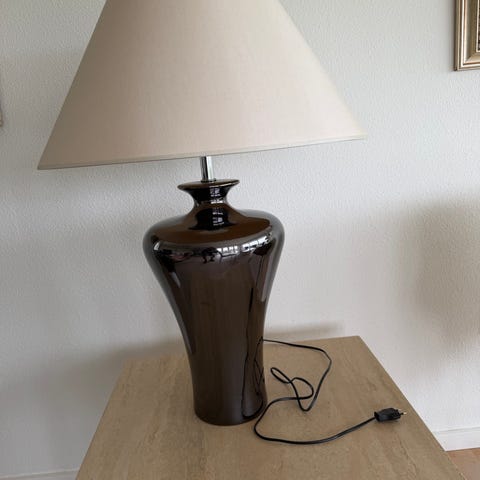 Smart og tidsløs bordlampe i sort glas, med stof skærm og stofledning. E27 fatning, 40cm høj.