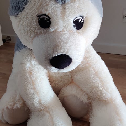 Ty bamse formet som en lille hund. Bamsen er hvid med lilla krøllet pels tpå ørerne og lilla sløjfer samt lille hale med lilla detalje. Bløde materialer og broderet næse med sorte plastøjne. Velegnet som krammebamse eller pynt på børneværelset.