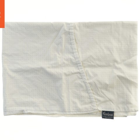 En tekstil genstand fra mærket Emmaljunga, målene er 100x70 cm. Farven er lys beige, og stoffet har et diskret mønster. Der er en mærkat der angiver 'Made in Sweden since 1925'.