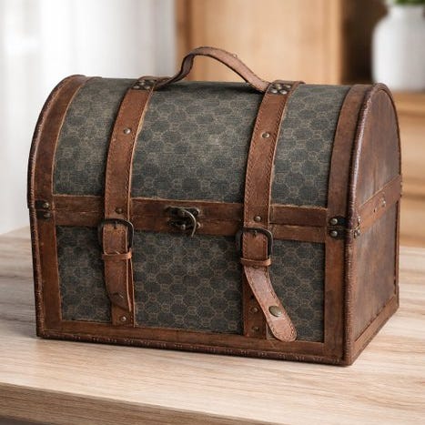 Dette objekt er en vintage rejsekiste eller skrin, et stykke antikviteter der værdsættes for sin historiske og dekorative værdi.