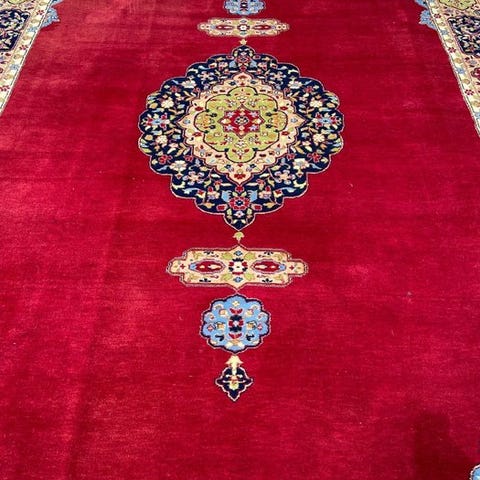 Maskinvejst tæppe af uld på bomuld fra Keshan, fremstillet i Tyskland i slutningen af det tyvende århundrede, måler 394 × 298 cm, vejer 40 kg, i god stand. Klik på den blå "gå til varen" knap, for at købe eller byde på denne vare. Den samlede pris vil blive vist inden du afgiver dit bud.
