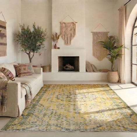 Et håndlavet vintage tæppe fra Tyrkiet, model 'Gold' Yellow vintage, lavet af uld på bomuld, 270 cm x 165 cm i guldfarvet, i meget god stand og professionelt renset med et certifikat på bagsiden. Klik på den blå "gå til varen" knap, for at købe eller byde på denne vare. Den samlede pris vil blive vist inden du afgiver dit bud.