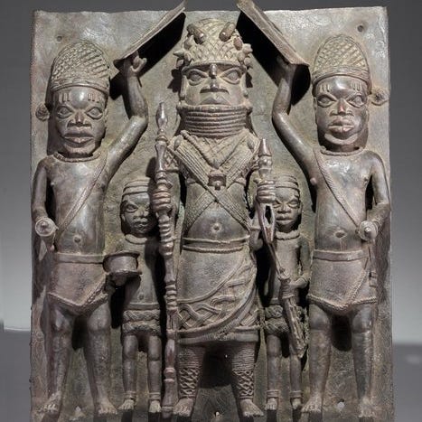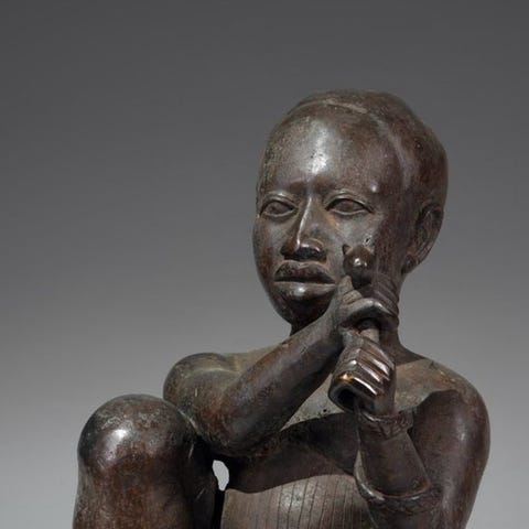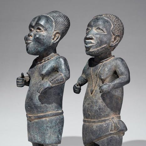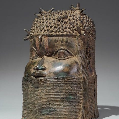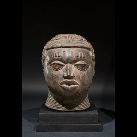 Original officiel bronze Oba alterfigur fra Nigeria, Benin-kulturen, fremstillet af et ukendt atelier i Bronze Casters’ Guild ved Igun Eronmwon, 55,5 cm høj, 7,5 kg, i tilstandsdiscrete og uden stand. Klik på den blå "gå til varen" knap, for at købe eller byde på denne vare. Den samlede pris vil blive vist inden du afgiver dit bud.