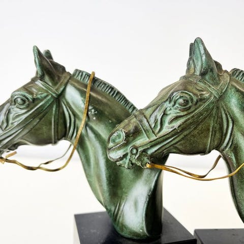 Bronze-skulptur med titlen 'Jockey à cheval' i Realisme-stilen, 36 cm bred, 25 cm høj, 15 cm dyb, vægt 4 kg, fremstillet i Frankrig, i fremragende stand og ikke underskrevet. Klik på den blå "gå til varen" knap, for at købe eller byde på denne vare. Den samlede pris vil blive vist inden du afgiver dit bud.