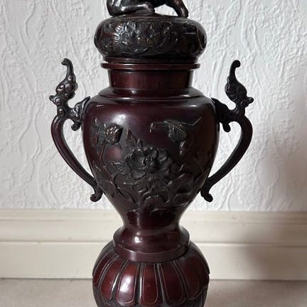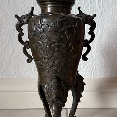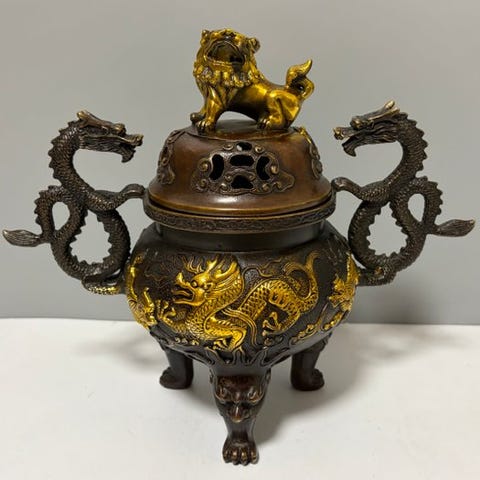 Bronzebrænder til parfyme med champlevé emalje i Shang-dynastistil, oprindelse Japan, seneste del af 1800-tallet til begyndelsen af 1900-tallet, dimensioner 27 × 23 × 18 cm, i pæn stand med få slidmærker og aldersrelaterede pletter. Klik på den blå "gå til varen" knap, for at købe eller byde på denne vare. Den samlede pris vil blive vist inden du afgiver dit bud.