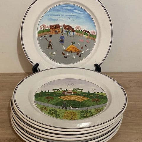 Smukt sæt dekorative porcelænsposer af porcelæn med naïve stil illustrationer, signerede af den franske kunstner Gérard Laplau. Hvert stykke viser en forskellig scene fra landlivet og hverdagen, med levende farver og charmerende detaljer.