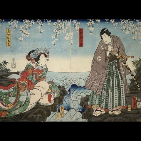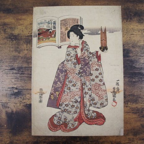 En håndsigneret træsnit af Utagawa Kunisada med titel Ukiyo-e Mirror, fra Edo-tiden (ca. 1850), trykt på washi-papir i Nishiki-e-teknik, målene 38 cm x 26,3 cm, vægt 500 g, i rimelig stand. Klik på den blå "gå til varen" knap, for at købe eller byde på denne vare. Den samlede pris vil blive vist inden du afgiver dit bud.