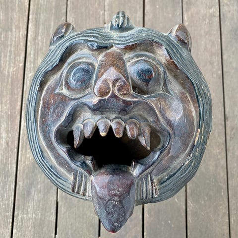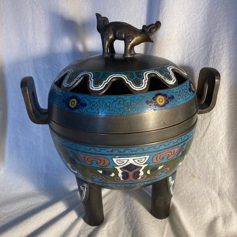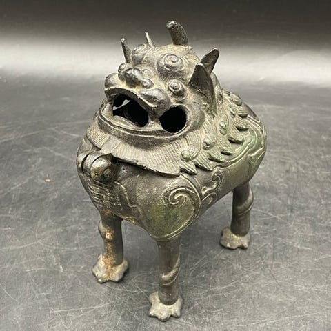 Bronze røgelsesbrænder fra Japan, ca. 1960’erne–1980’erne, med dragemotiver og et Foo Dog-låg med tre ben, åbent låg til cigarrerosler, gyldne højder og vægt 1,73 kg, målene er 28 x 15 x 23 cm, i god stand med alderstegn. Klik på den blå "gå til varen" knap, for at købe eller byde på denne vare. Den samlede pris vil blive vist inden du afgiver dit bud.