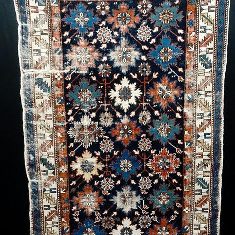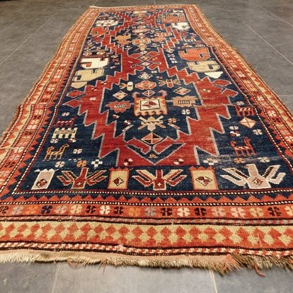 Oprindelse: Aserbajdsjan; Model: Sjælden antik Kazak-tæppe fra sidste halvdel af det 19. århundrede, mål 275 cm×107 cm, uld on uld. Klik på den blå "gå til varen" knap, for at købe eller byde på denne vare. Den samlede pris vil blive vist inden du afgiver dit bud.
