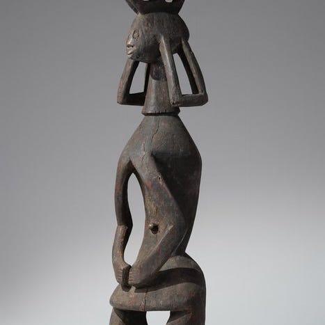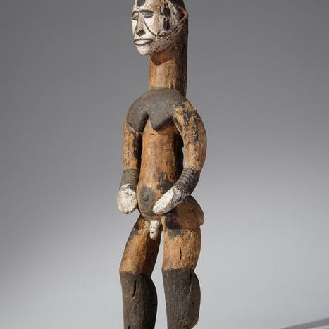 En træskulptur fra Nigeria af Ijo-folket, med titlen "A wooden sculpture", autentisk/original, i rimelig stand, 117 cm høj, vægt 10,3 kg, solgt uden stand. Klik på den blå "gå til varen" knap, for at købe eller byde på denne vare. Den samlede pris vil blive vist inden du afgiver dit bud.
