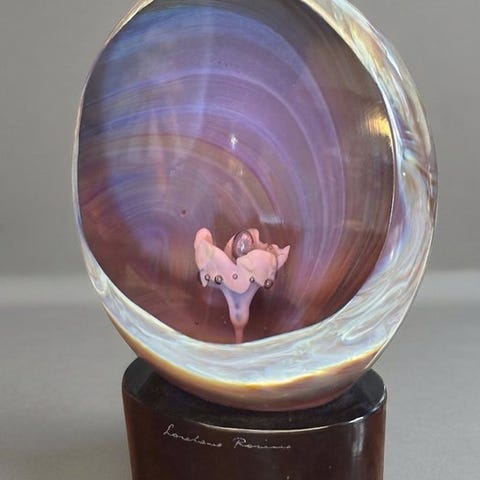 Arbejdet fremhæver soliditeten i det tætte glas, de bløde overflader og de dybe nuancer i fumé, med lysets spil der fremhæver figurens volumen og bevægelse. Skulptur med stor dekorativ effekt, ideel for samlere, elskere af samtidskunst og kunstglas.